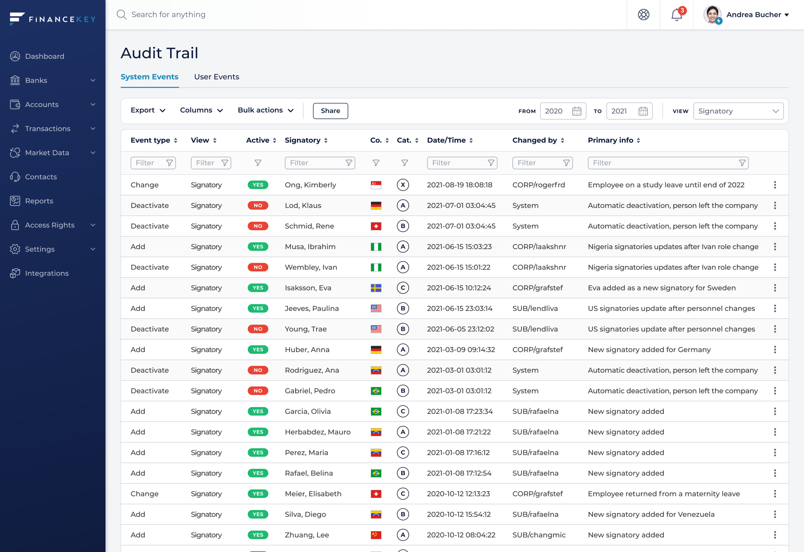 We log all system and user-related actions into the audit trail. All the steps in transactions get recorded.